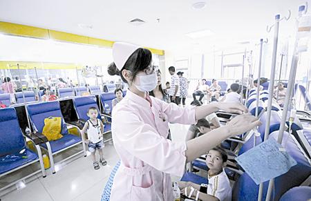 近日,平顶山市中医院在门诊大楼内增设了由3个大厅组成的少儿输液中心,室内的装饰全部以少儿喜爱的卡通造型为主。这既解决了患儿输液难的问题,又从环境上缓解了患儿的紧张心理。图为输液中心医护人员为患儿调整输液速度。 李英平 王 平/摄