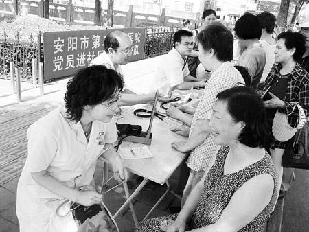 日前,安阳市第二人民医院与西大街办事处、大寺前社区、冠带巷社区联合举办“党员进社区义诊便民服务”活动,受到社区群众的热烈欢迎。图为义诊现场。
