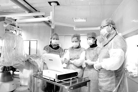 近日,安阳地区医院心内科成功为一名心脏已扩大至正常两倍的严重心脏病患者实施了心脏三腔起搏除颤器植入术。据悉,具有国内领先水平的三腔起搏除颤器植入术对医院的设备、医生的技术都有很高要求,目前全国每年完成的该手术数量约20台。图为安阳地区医院心内科的医护人员正在调试三腔起搏除颤器的参数。 张治平 刘 洁 李宪文/摄