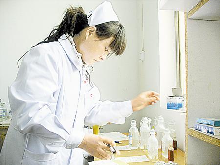 三门峡市湖滨区高庙乡卫生院以“创建优质护理示范工程”为契机,加强临床护理操作规程,用优质规范的护理操作和服务赢得了住院患者的一致好评。图为该卫生院护士在注射室内仔细填写注射液体相关信息时的情景。 侯青峡/摄
