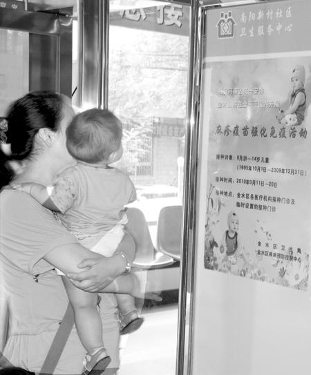郑州大桥医院门诊大厅,一名家长抱着孩子认真观看麻疹强化免疫宣传知识。张晓华/摄