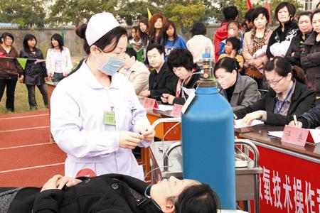 9月28日,滑县职工技能大赛在新区广场举行。图为参赛的卫生系统人员。