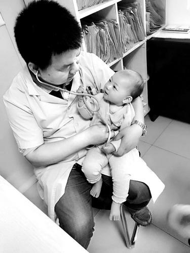 7月21日上午,武陟县第二人民医院儿保科医务人员王文学在和患儿玩耍。在给这位患儿体检时,王文学的细心打动了患儿家长。侯林峰 赵 丽/摄