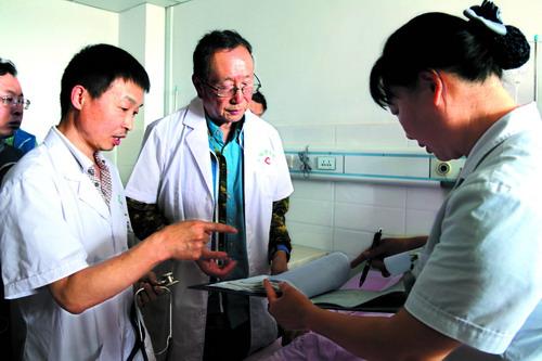 在为当地医务工作者和群众讲完一个多小时的《健康五大处方》的医学科普讲座后,12时,胡大一在郑州大学附属郑州中心医院专家志愿者的陪同下,来到荥阳市中医院住院部8楼病区为危、急、重症患者查房、巡诊。 今年88岁的李老太太患有冠心病多年,近来病情不断加重。由于过分恐惧,李老太太的睡眠质量非常差,她还出现了焦虑症状。胡大一详细查看完患者的病历后,善意地告诉患者:“您别紧张,这个病能治好。”听到大专家这样说,李老太太松了一口气,拉起胡大一的手,流着眼泪说:“谢谢大专家来给我看病。”随后,胡大一不仅为患者的主治医生提了建议,还为患者制订了下一步治疗方案。 与李老太太同病房的张老太太也患有严重的心脏病。胡大一刚给李老太太看完病,张老太太的家属连忙把他请了去。在一旁的当地医生拿着笔记本快速地记录着胡大一说出的每一条治疗建议。询问患者病情,查看病历,提出治疗建议,忙完这些工作,直到12时40分,胡大一才结束查房、巡诊工作。 “胡大一不仅医疗技术精湛,还热衷于公益事业,他用行动传递着卫生计生职业精神,不愧为全国杰出医务工作者的代表,是广大医务工作者学习的好榜样。”跟随胡大一查完病房,郑州大学附属郑州中心医院的党委书记丁凡告诉记者,近年来,该院联合胡大一通过举办公益活动,强素质、提水平、铸医魂,俯下身子切实为群众的健康服务,取得了广大人民群众的认可和好评。 “这是一次非常好的学习机会,通过与郑州大学附属郑州中心医院的专家一起为患者看病,我们拓宽了诊治疾病的视野,并为今后更好地为患者健康服务积累了宝贵的经验。”谈起此次公益活动,荥阳市中医院医师马军霞对郑州大学附属郑州中心医院的专家赞不绝口,并表示今后将多向郑州的专家学习,提高自身技术水平,服务好当地患者。