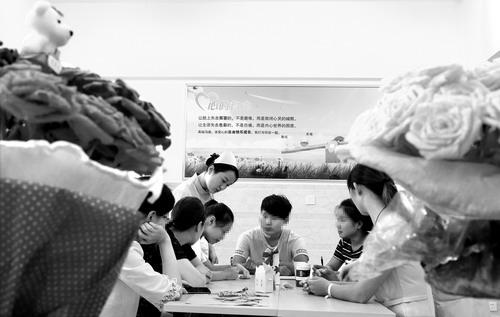 8月4日9时30分许,驻马店市精神病医院护士正在带领精神障碍患者做手工。