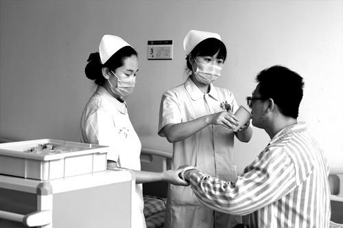 8月4日10时20分许,驻马店市精神病医院的两位护士正在给一位精神障碍患者喂药。