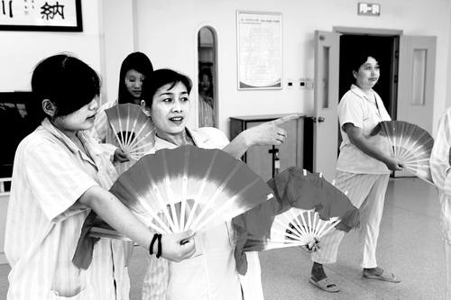8月4日9时40分许,驻马店市精神病医院的一位医务人员正在陪伴精神障碍患者做操。 |