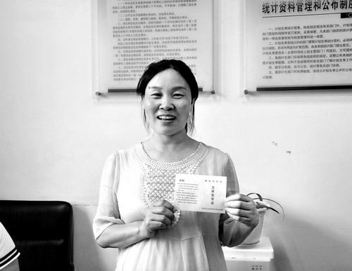 8月11日,家住灵宝市的王金玲在展示前不久领取的“三孩生育证”。这是今年5月27日《河南省人口与计划生育条例》修改以来,灵宝市卫生计生委办理的第一张居民“三孩生育证”。新条例规定,夫妻双方合计已生育两个子女,且没有共同生育子女的,可以申请再次生育子女;王金玲夫妇符合这种条件。李盘铭 常 沛/摄