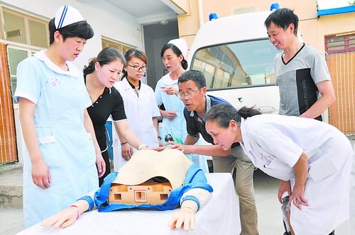 8月16日,三门峡市湖滨区高庙乡卫生院医务人员在专家指导下,对“患者”进行面罩吸氧(辅助呼吸)操作。据悉,为了加强防汛及其他突发事件的急救工作,该院医务人员开展了包扎止血、伤员搬运、心肺复苏、骨折固定等实地操作训练,以提高医务人员的急救水平和突发事件应急处置能力。侯青峡 赵党宏/摄