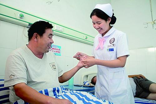 8月15日上午,确山县中医院的护士在病房里为患者剪指甲。今年,该院开展了形式多样的优质护理服务活动,一季度评选一次“优质护理服务之星”就是其中一项。丁宏伟 牛红丽/摄