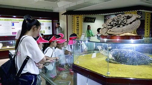 8月17日,参加温县中医院青少年“杏林夏令营”的中小学生,在大宋中医药文化博物馆展柜前仔细观察中药材动物标本。李 季/摄