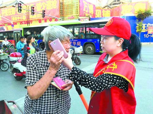 9月21日上午,一位身穿红马甲、头戴小红帽的志愿者帮助一位与家人失去联系的老人联系家人,并向老人赠送了黄手环。当天,这位来自开封市中心医院外科党支部的志愿者,同其他5位志愿者一起,在街头开展了“关爱老人 防治痴呆”主题活动。 李 季/摄 |