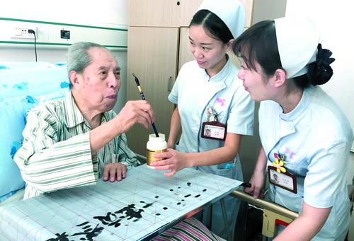 9月21日下午,在郑州市豫欣老年病医院医务人员陪同下,一位97岁的老人在病床前练习毛笔字。老人出身于书法世家,练习书法已50余年,两个多月前入住该院康欣舒缓病区,每天除了输液治疗,坚持练习书法。老人积极乐观的生活态度感染了每一位医务人员,医务人员在工作之余常常到老人病床前看他练习书法。史 尧 靳巍巍/摄