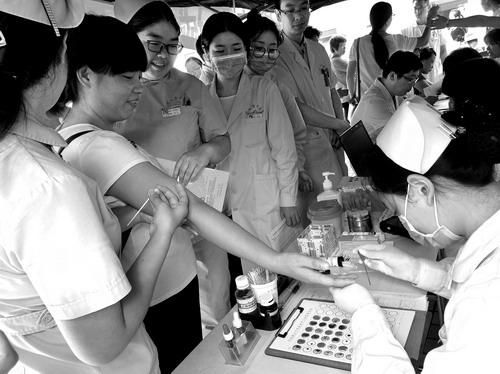 本报讯 (记者杨 须)9月21日,为了缓解目前的临床用血压力,展现巩义市中医院医务人员“悲悯为怀、助人为乐、救死扶伤”的良好精神风貌,该院与河南省红十字血液中心合作,开展了2016年秋季无偿献血活动。 为了保证此次献血活动顺利进行,巩义市中医院提前3天将活动通知及献血科普知识宣传资料下发到各科室,向广大医务人员宣传无偿献血的意义及献血前的注意事项,提高了医务人员对积极参与无偿献血活动的认识,为挽救生命贡献自己的力量。 在活动现场,参与献血的医务工作者在采完血后立即回到工作岗位上。大家表示,作为一名医务工作者,通过无偿献血帮助急需救治的患者,是一件非常有意义的事情。不少医务人员还带着家属前来献血。进行咨询、填表、体检……献血活动在河南省血液中心工作人员的指导下有序进行。本次献血活动从8时30分持续到12时。 据统计,此次活动,共有134人踊跃献血,献血量达到46700毫升,在一定程度上缓解了目前临床用血紧张状况。此外,还有37人加入造血干细胞捐献志愿者队伍。