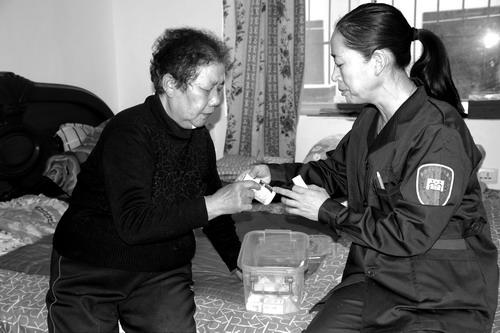 10月25日上午,在焦作市某小区,焦作市民主社区卫生服务中心医生任凤霞在给一位老人解释如何用药。走入居民家中,指导合理用药、控盐、控油等,是焦作市家庭医生签约服务的重要内容。
