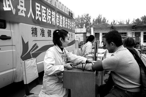 11月8日,修武县人民医院专家在为群众量血压。当天,该院内科、外科、骨科、儿科等科室的专家携带相关设备,到王屯乡前南孟村义诊,为该村的贫困户发放了健康扶贫卡,还发放了健康扶贫宣传资料,服务群众300余人。 高新科 李 峰/摄
