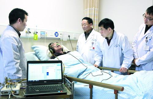 11月8日下午,一位在郑州市第十六人民医院神经外科住院治疗的患者在接受脑功能评估。近日,该院神经外科引进全国首台远程脑功能评估系统。该系统可以捕捉到昏迷患者的微弱意识信号,客观评估患者脑功能,医务人员可适时远程监护昏迷患者的脑功能状态。史 尧 李美均/摄