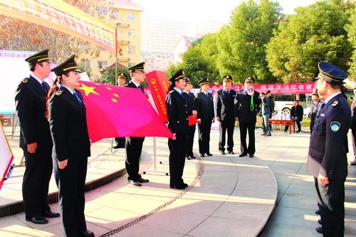 ⑤驻马店市卫生计生监督局全体监督员面向国旗宣誓。