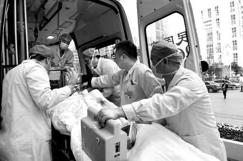 患者被省人民医院医务人员转下急救车,送往重症监护室