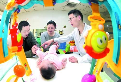 12月13日,郑州大学附属郑州中心医院儿科生长发育门诊的医务人员正在指导婴儿父母进行抚触按摩。据了解,该院儿科生长发育门诊重点关注高危儿、早产儿以及儿童早期发展等可能发生的发展障碍,指导父母及时与孩子建立早期亲密关系,改善发育结局,降低病残率。史 尧/摄