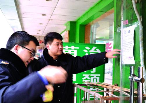 1月20日,焦作市山阳区卫生计生监督员对无证医疗机构进行取缔并粘贴公告。