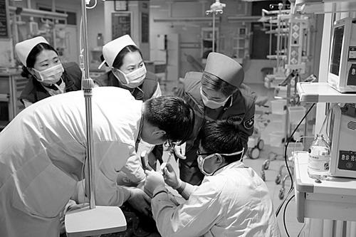 1月27日22时25分,在驻马店市中心医院急诊科抢救室里,医护人员正在抢救一位重症患者。 |