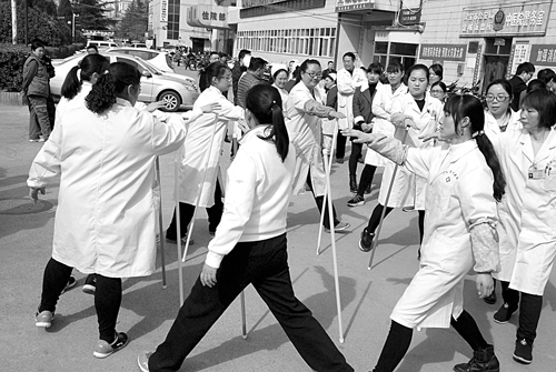 灵宝市中医院医务人员在参加“不倒森林”趣味活动。日前,灵宝市中医院在门诊楼前举行了“击鼓颠球”“不倒森林”等一系列趣味活动,全院广大医务人员参与进来。欢乐的气氛也吸引了不少路人,大家纷纷停下匆忙的脚步分享医务人员的快乐。 刘 岩 周元杰/摄