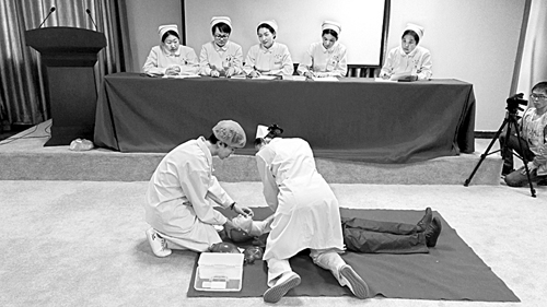4月25日下午,在考核现场,两名护理人员对“患者”进行心肺复苏。当天,郑州中泰脑科医院举行了2017年度护理技能考核比赛,鼓励大家通过比赛提升专业技能。 徐琳琳/摄
