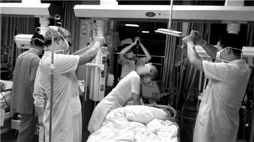近日,一名因车祸外伤造成多发骨折、创伤性休克的患者被救护车送到新乡市第二人民医院重症监护室抢救。 当时,医务人员测不出患者的血压,患者呼吸停止,生命危在旦夕。该院医务人员快速为患者采取心肺复苏、输血等措施。但是,正常的滴速无法满足患者衰弱身体的需求,为此,医生、护士轮流把血袋举过头顶,用手给血袋加压,汗水湿透了医务人员的衣服,但他们一直在坚持着。整整两个半小时,为患者输了十几袋血,终于把患者从死亡的边缘拉了回来。 常俊伟 郭明青/摄