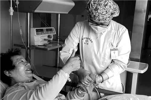 近日,新乡市第二人民医院心血管内科病房内,护士姚政一边给患者阿姨洗脸、擦手,一边把值夜班时成功抢救一位心脏病患者的经历分享给这位阿姨,患者感动得竖起了拇指。 据悉,当天姚政值夜班时,一个突发心脏病的患者经过5次心肺复苏,终于被抢救了过来。看着姚政那灿烂的笑容,人们为她纯洁的心灵和善良所感动。 常俊伟 郭明青/摄