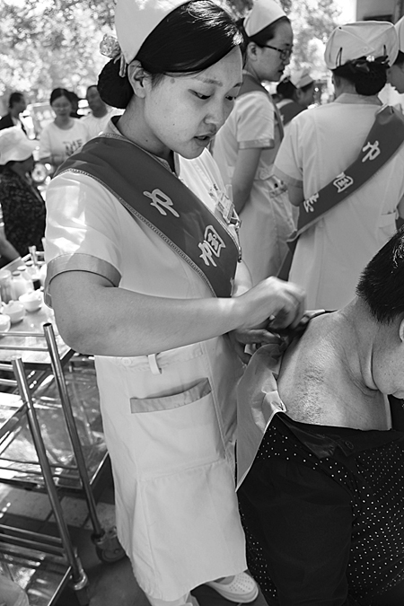 5月12日上午,在偃师市中医院大门西边的广场上,20余名护士在采用中医特色疗法为病人免费治疗疾病,项目有拔罐、刮痧、针刺、艾灸、中药贴敷、推拿等,现场接受治疗者达200余人。护士们用这种方式过了一个特殊的护士节。 刘永胜 李宗伟/摄