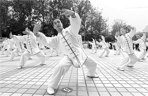 河南省中医院的医务人员在表演八段锦。日前,该院举行八段锦比赛,临床、行政科室医务人员组成27支代表队,在音乐声中诠释各自对八段锦内涵的不同理解。 史 尧/摄