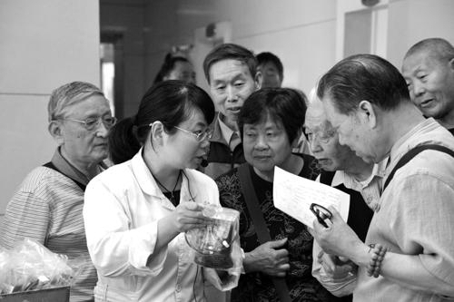 河南省红十字血液中心工作人员向河南老年诗词研究会的老同志们介绍血液采集、检验等主要工作流程。