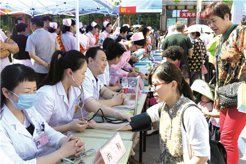 医务人员在为市民义诊。今年5月29日是中国计生协会成立37周年纪念日。5月21日上午,郑州市管城区卫生计生委、区计生协会在郑州福都广场举行了以“关爱流动人口 助力健康同行”为主题的计生协会纪念日活动。在活动现场,医务人员和计生志愿者通过文艺汇演、健康知识讲座、义诊等活动宣传卫生计生政策,倡导健康生活理念和文明向上的家风。 冯金灿/摄