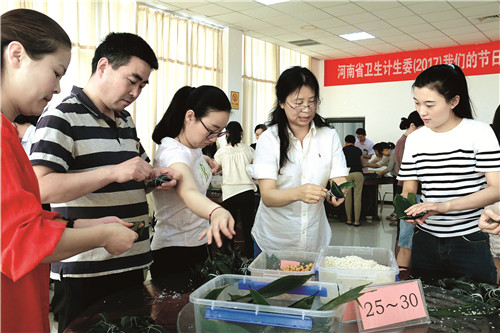 →选手们在比赛包粽子。5月25日,在端午节即将来临之际,河南省卫生计生委举办了(2017)我们的节日“结五彩 包粽子”比赛。经过激烈角逐,最终省医学会书记郭金玲在36名选手中脱颖而出,在规定时间内包完49个粽子,取得了数量第一的好成绩。 杨冬冬/摄