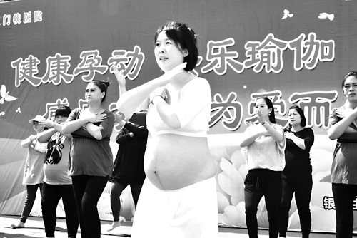 5月12日,在黄河三门峡医院举办的“健康孕、快乐瑜伽、感恩有你、为爱而生”的大型公益活动现场,一位孕妇正在做孕期瑜伽。当天的活动以孕期瑜伽和韵律操为主。该院还开展了导乐训练和“超级奶爸”训练。刘 岩/摄
