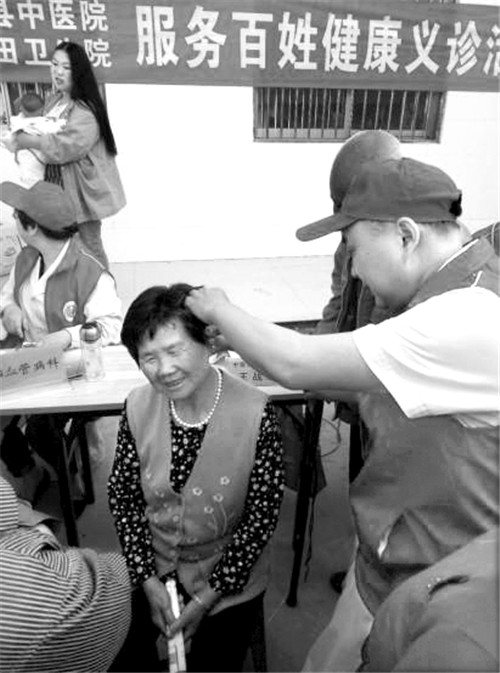 日前,温县中医院为番田镇大金香村的村民进行了健康义诊和健康咨询,现场为村民答疑解惑,宣传中医药保健知识,让村民掌握基本的防病方法。图为该院医务人员为村民检查耳病。