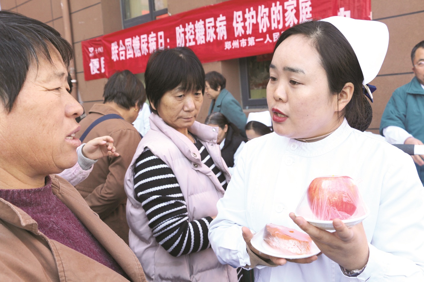 11月14日,郑州市第一人民医院外联办组织内分泌科专家团队走进社区,举办2019年联合国糖尿病日暨“蓝光行动”活动。专家团队为市民免费测血糖、量血压、测骨密度,进行糖尿病风险评估,同时给予糖尿病患者饮食、运动及用药指导,发放糖尿病健康教育资料。 王占锋/摄