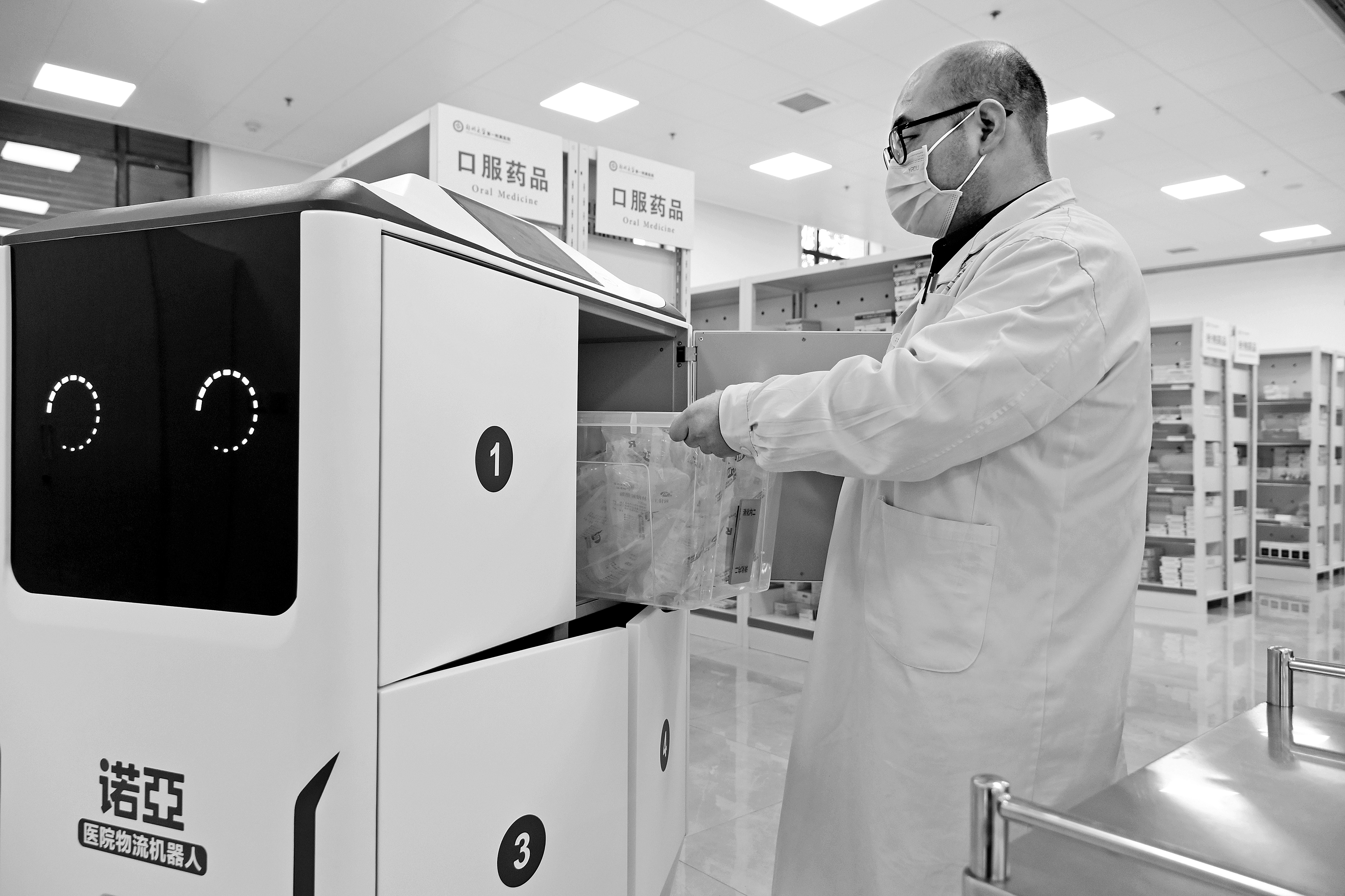 本报讯 (记者常 娟 通讯员闫良玉 蔡昊男)疫情防控形势下,采用智能机器人配送药品、医疗器械等工作,减少感染风险……日前,诺亚医院物流机器人正式“入职”郑州大学第一附属医院(以下简称郑大一附院)南院区,负责19个科室的药品运送,标志着该院开启了5G(第五代移动通信技术)智慧医院物流新时代,助力院感防控(如图)。 作为一名优秀的医疗保障“员工”,诺亚医院物流机器人主要负责郑大一附院南院区七号楼、八号楼共计19个科室的药品运送,以后会陆续开展耗材、后勤物资运送等工作。 该院引进的智能物流机器人,不仅是时代新形势驱动下的产物,更是信息化、智能化发展的标志。国家卫生健康委、国家发展改革委在2020年7月30日发布的《综合医院“平疫结合”可转换病区建筑技术导则(试行)》文件中明确指出:综合医院“平疫结合”建设,应当充分利用物联网和人工智能,并且在污染区采用智能机器人配送药品、医疗器械、餐食等工作,减少感染风险。相较于传统人工配送,诺亚医院物流机器人配送在院感防控方面优势非常明显,机器人不惧怕飞沫,可以节约防护服等物资,产生的医疗垃圾少;只在医院内部活动,有效避免感染外延风险。 同时,机器人能够高效解决全院物资的配送问题,提升医务人员工作效率。医务人员在配送系统完成下单,机器人便可快速准确地将物品送到指定地点,缓解了人力不足的问题,把时间还给医务人员,让他们有更多时间为患者服务。