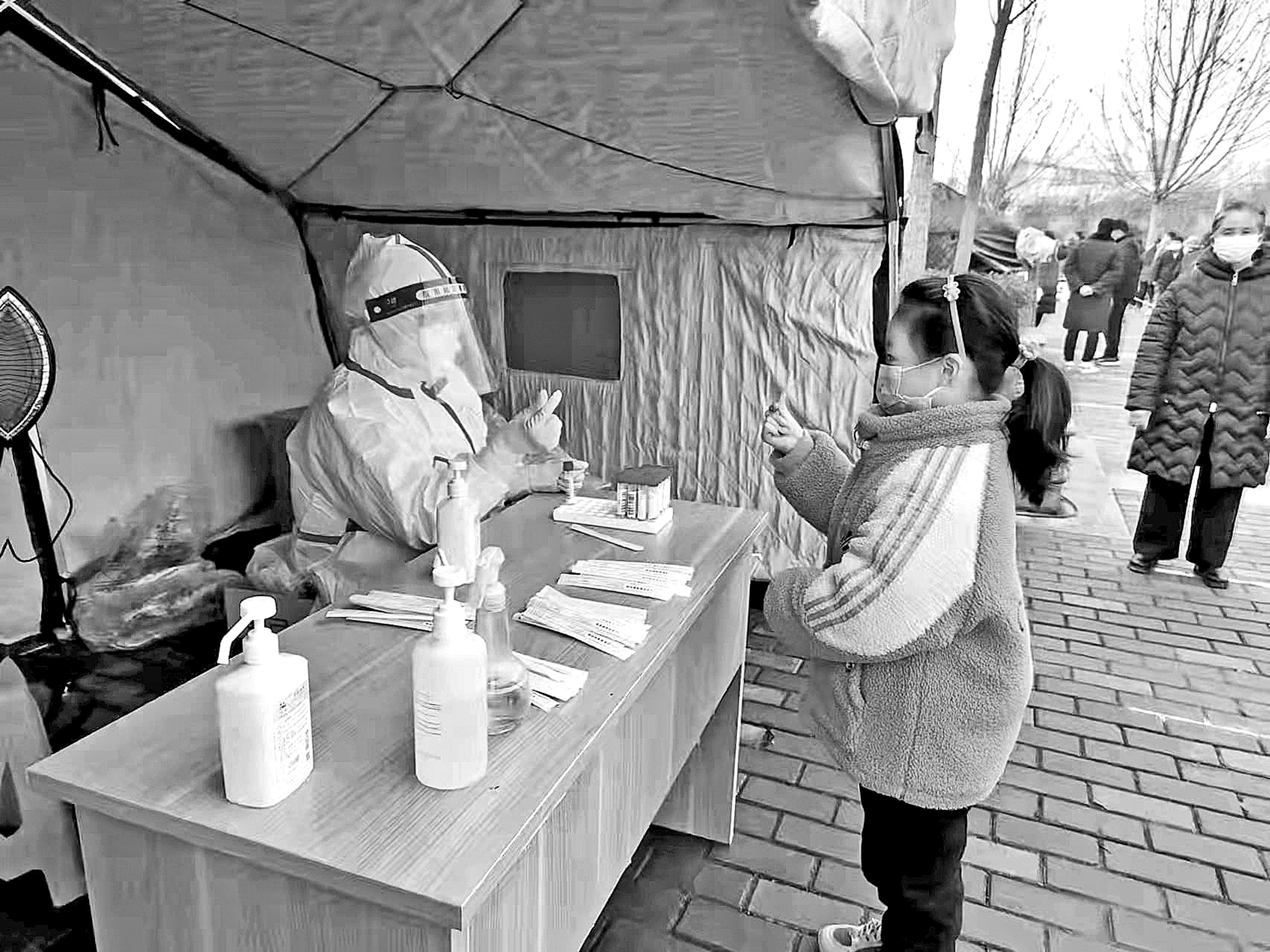 2022年1月8日,在郑州市上街区峡窝镇冯沟村,郑州市第六人民医院医务人员为小朋友开展核酸检测采样,小朋友以比心的方式向医务人员表示感谢。 丁 玲 王 璞/摄