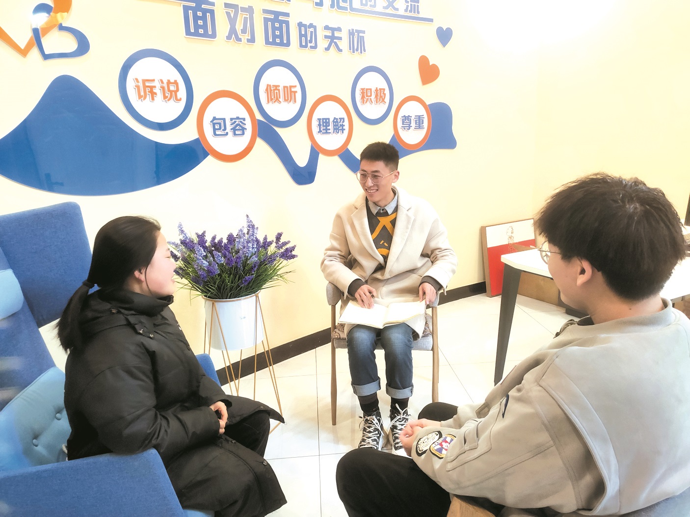 辅导员陈林(中)和学生进行思想沟通