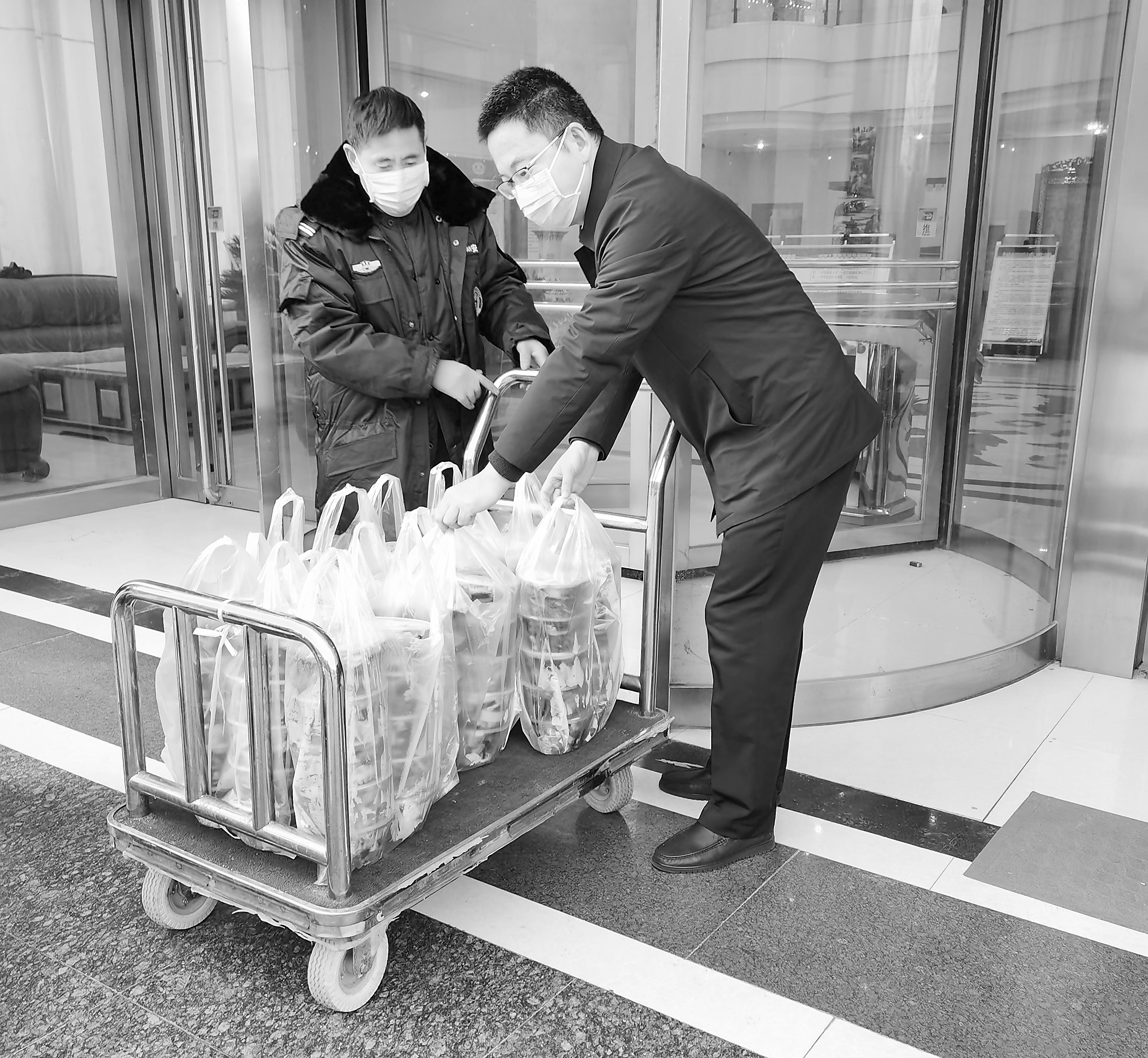 抗疫中的荣洁(左)、张宾(右一) 李 欢 闫贝贝/摄 |