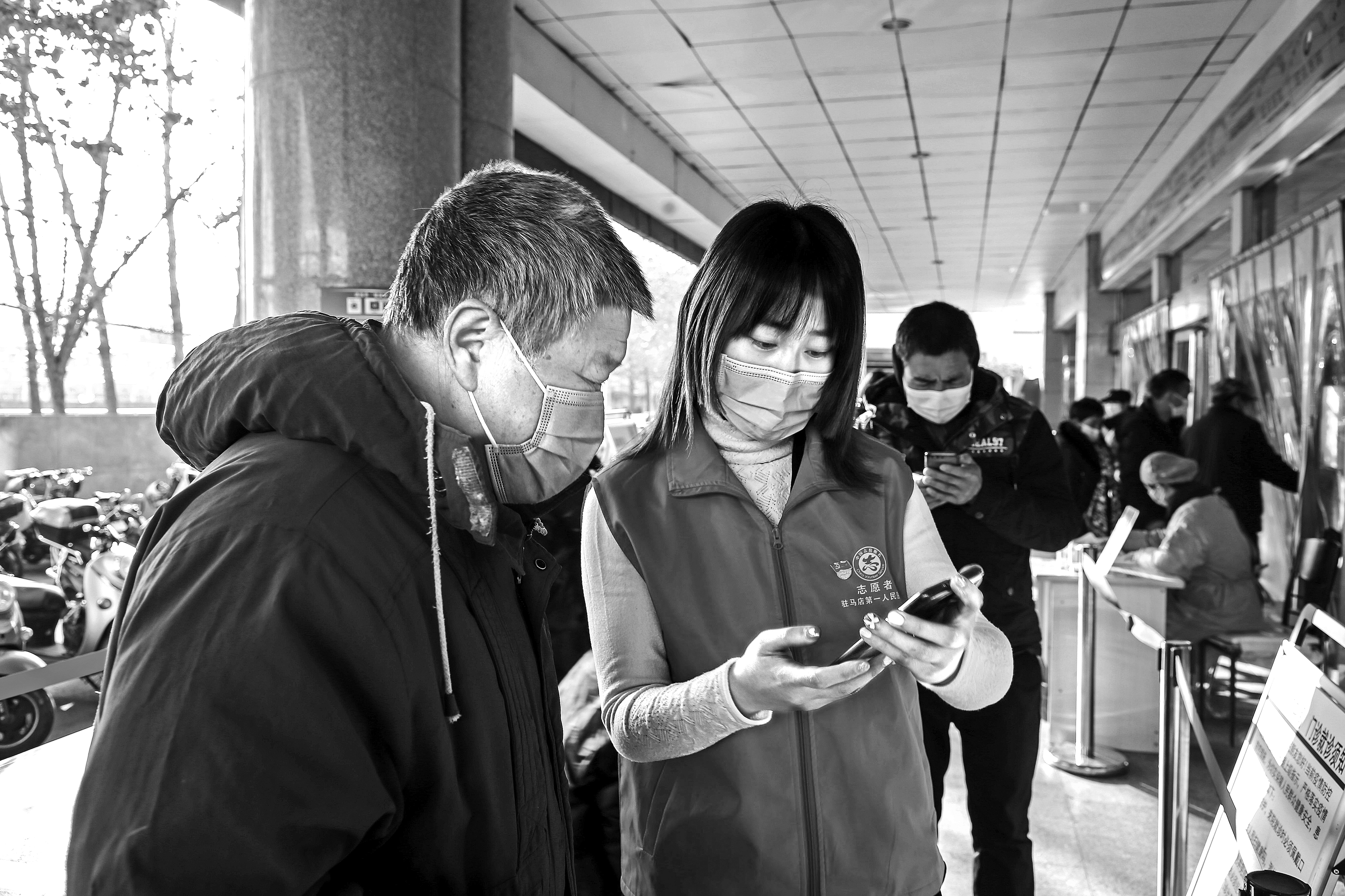 1月13日,在驻马店市第一人民医院门诊楼入口,志愿者正在帮助就诊患者登记个人扫码信息。驻马店市第一人民医院党员志愿者用实际行动践行共产党员的先锋模范作用,助力疫情防控工作。 丁宏伟 邢小宝/摄 |