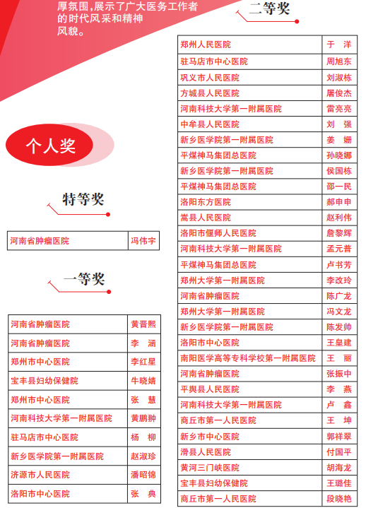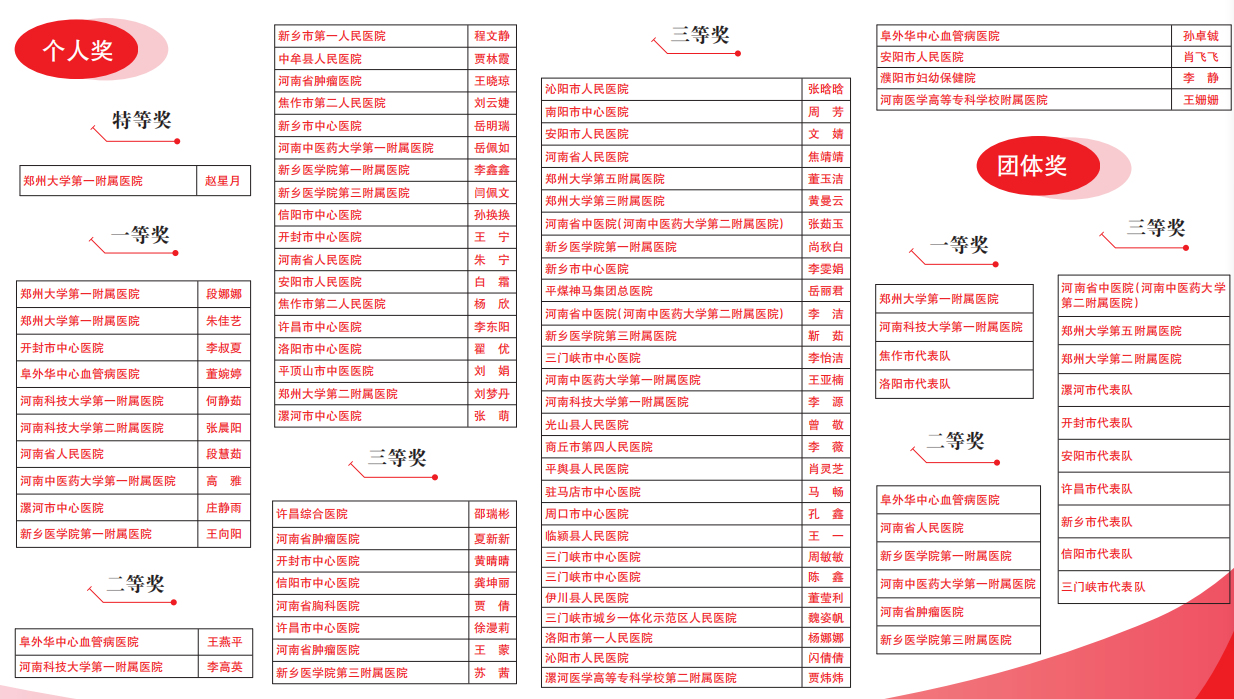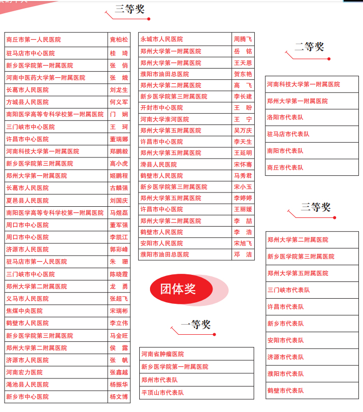 近日,由河南省卫生健康委、河南省总工会联合举办的河南省第一届护理技能竞赛决赛、河南省第三届腔镜基本技能竞赛决赛在郑州落幕。经过激烈的角逐,评委专家认真评审,大赛圆满完成,评出了两场医疗技能竞赛的个人奖和团体奖(名单如下)。通过竞赛,一大批专业骨干和技术人才脱颖而出,带动医疗队伍专业水平不断提高;全省 持续掀起“学知识、比技能、争先进”的热潮,营造了“比、学、赶、帮、超”的浓 厚氛围,展示了广大医务工作者的时代风采和精神风貌。