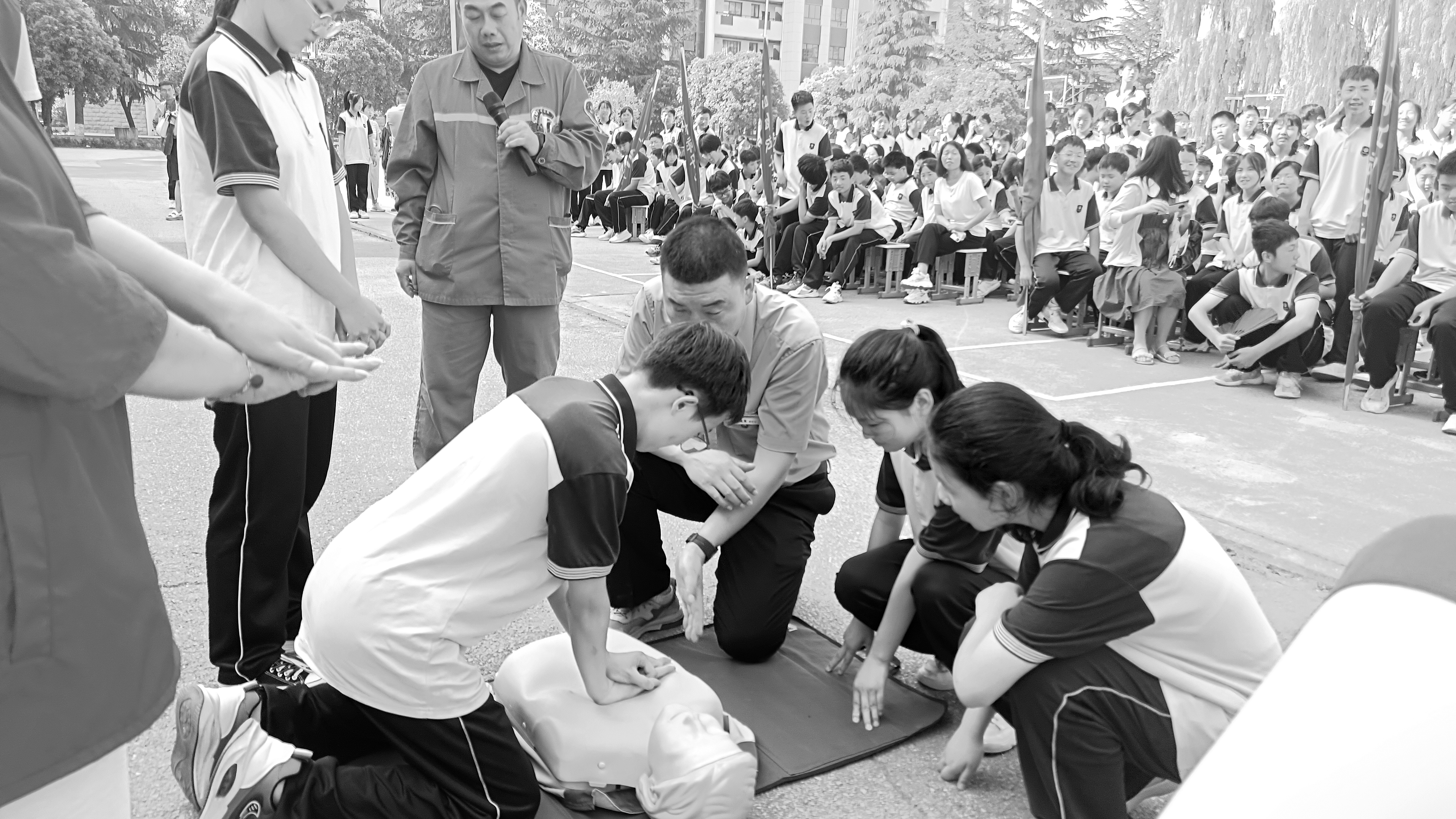 6月27日,在卢氏县一所学校,学生在急救人员指导下练习心肺复苏。当天,卢氏县120急救指挥中心组织工作人员走进学校,开展以“珍爱生命、预防溺水”为主题的急救知识宣传培训活动。培训现场,急救人员为学生培训心肺复苏,讲解预防溺水的常识和遇到溺水时正确自救、互救的安全知识。 刘 岩 孙雅丽/摄