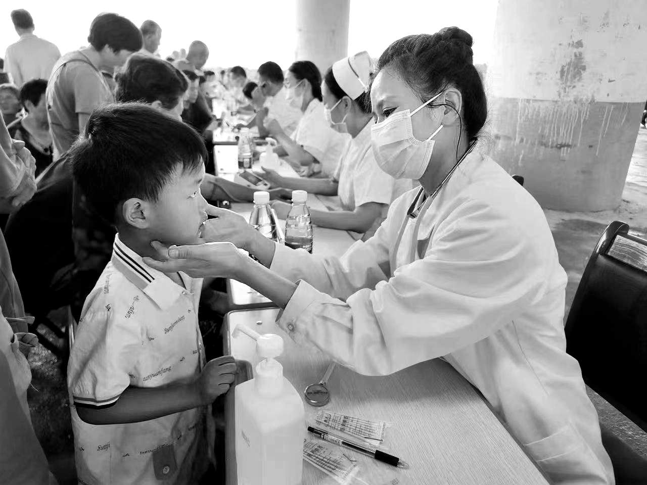 ↑7月14日,在民权县龙塘镇付庄,医务人员为群众检查身体。当天,农工党商丘市委会联合商丘市第一人民医院专家赴民权县龙塘镇付庄村开展健康义诊活动。