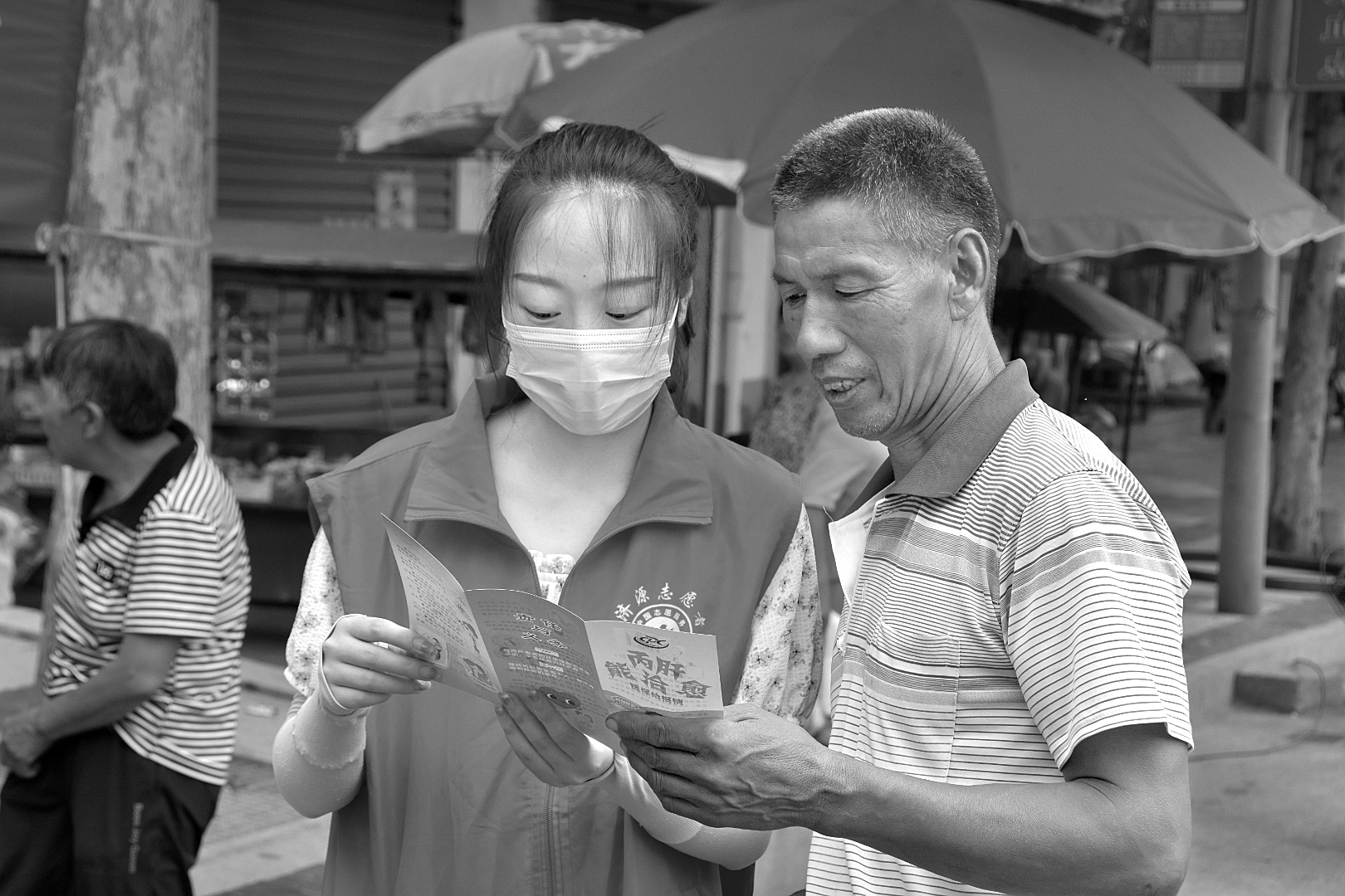 图②7月28日,在济源市王屋镇王屋村,志愿者为群众普及肝炎防治知识。当天,济源市疾病预防控制中心开展主题宣传活动,普及肝炎防治知识。 王正勋 侯林峰 卢铁军/摄