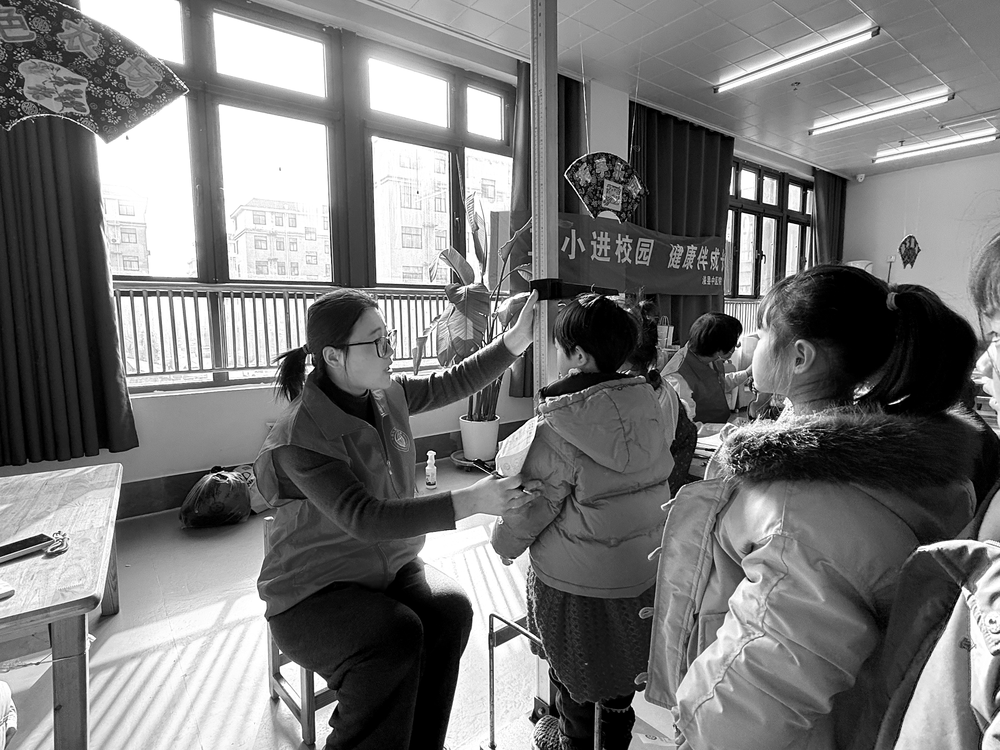 医务人员为小朋友测量身高